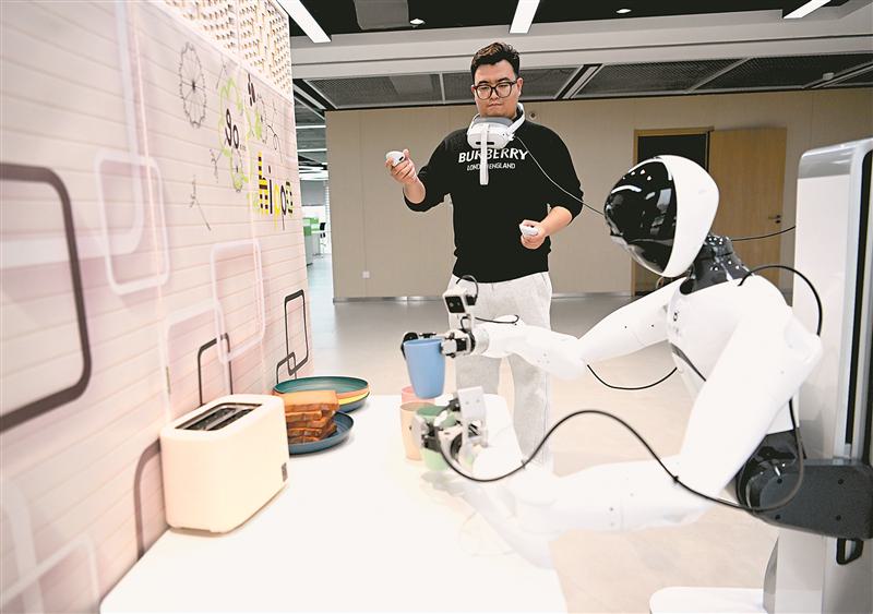 图为3月17日,工作人员对机器人进行具身智能训练。