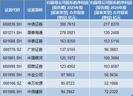 其中,中信证券2025年的净利润超过300亿元,以300.76亿元的盈利水平排名第一。国泰海通紧随其后,去年净利润达到278.09亿元。