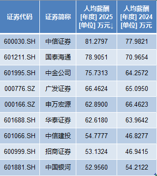 广发证券、申万宏源、华泰证券的2025年人均薪酬超过60万元;中信建投、招商证券、中国银河的去年人均薪酬超过50万元。