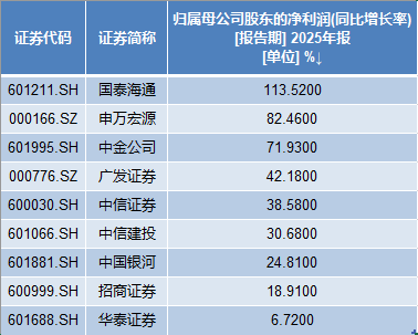 广发证券、中信证券、中信建投去年的净利润增幅超过30%,分别有42.18%、38.58%、30.68%。银河证券、招商证券、华泰证券2025年的净利润增幅分别为24.81%、18.91%、6.72%。