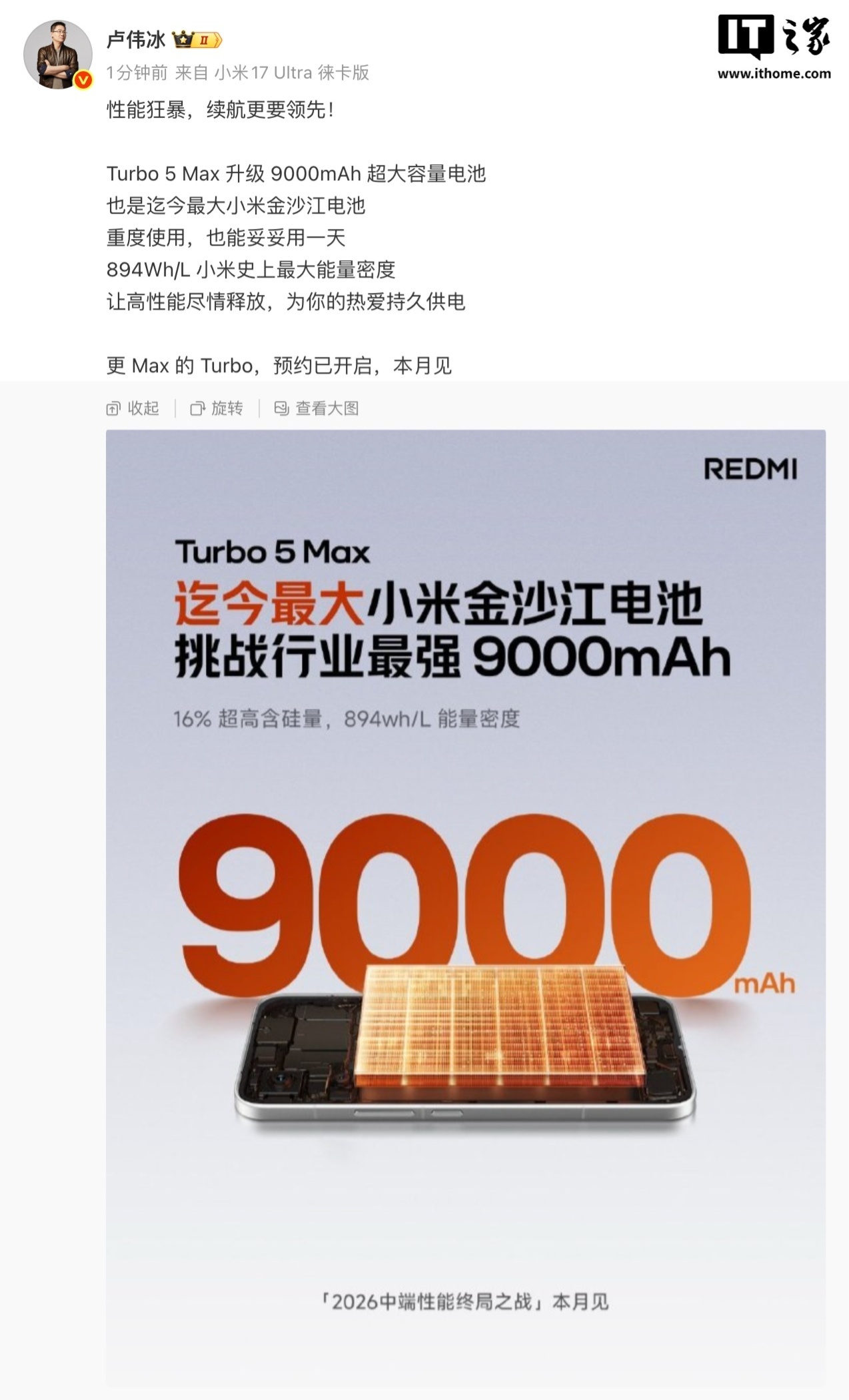 优雅大 R 角 + 极窄边框CNC 金属中框 + 旗舰玻纤背板金属跑道型 Deco + 双环涡轮灯带新色海风蓝据IT之家今日稍早时候报道,小米集团合伙人、总裁、手机部总裁、小米品牌总经理卢伟冰发文宣布,REDMI Turbo 5 Max 升级 9000mAh 超大容量电池,也是迄今最大小米金沙江电池,重度使用也能妥妥用一天,具有 894Wh/L 小米史上最大能量密度。