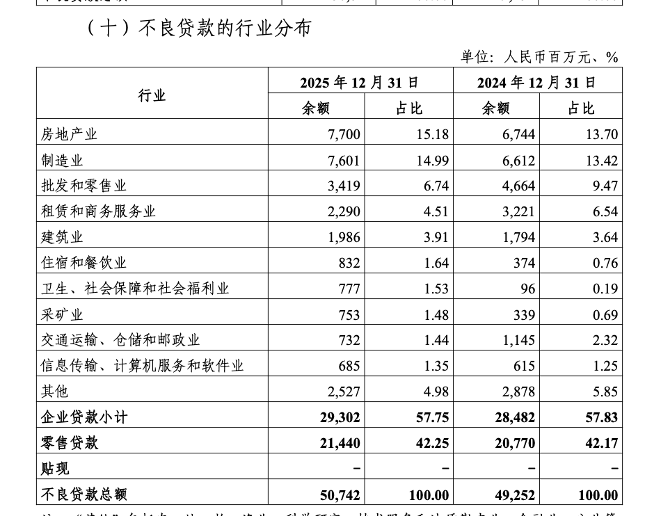 从不良贷款的行业看,房地产仍是占比最高的行业。2025年,该行房地产不良贷款余额为77亿元,占比15.18%,较2024年占比增加1.48个百分点。批发与零售业不良贷款余额减少12.45亿元,而住宿和餐饮业不良贷款余额由2024年的3.74亿元增至8.32亿元。