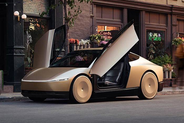 车身侧面,可以看到Cybercab整体采用了流畅的轿跑式车身造型,拥有非常动感的身姿,并采用了飞翼式蝴蝶门设计,开闭起来非常拉风。值得一提的是,新车两侧没有设置外后视镜和充电接口,新车还是一款双门车,这也意味着其内部会是一个单仓布局。